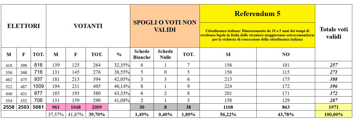 | Votanti domenica ore 23 | Totale | 1589 | 31,40% |