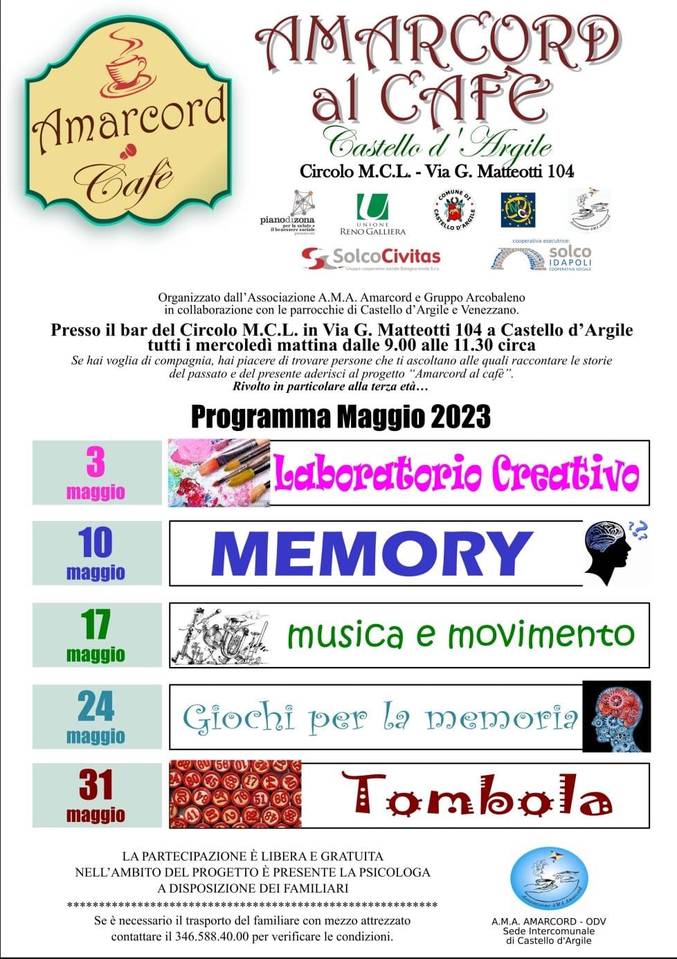 Organizzato dall'Associazione A.M.A. Amarcord e Gruppo Arcobaleno, in collaborazione con le Parrocchie di Castello d'Argile e Venezzano, presso il bar del Circolo M.C.L. in via G. Matteotti 104 a Castello d'Argile, tutti i mercoledì mattina dalle 9.00 alle 11.30 circa.