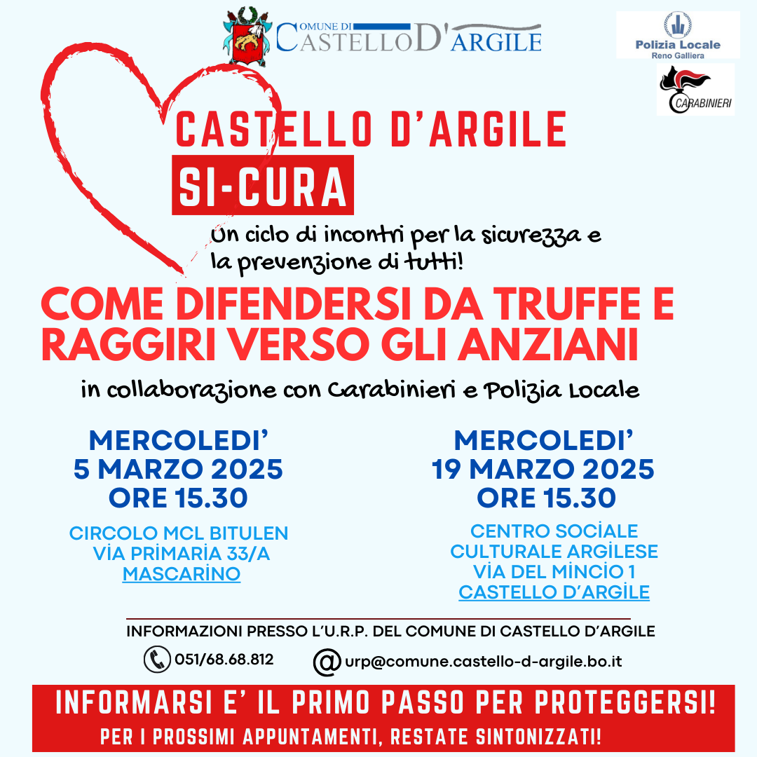 Il Comune di Castello d'Argile, in collaborazione con esperti e forze dell'ordine, organizza una serie di incontri per informare e sensibilizzare la cittadinanza su temi cruciali per la sicurezza e per la prevenzione.