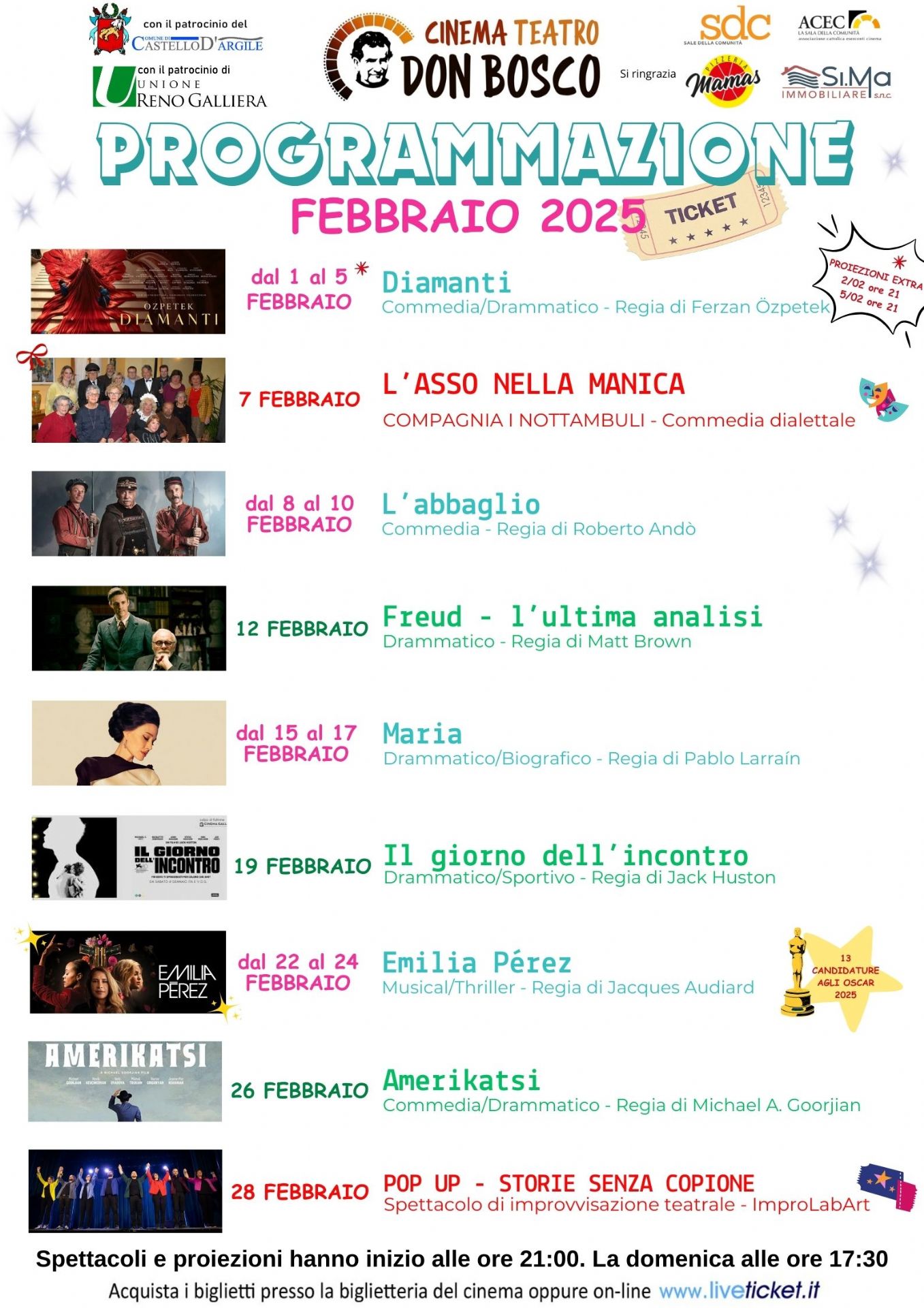 E' disponibile la programmazione delle rassegne cinematografiche in programma nel mese di FEBBRAIO 2025 presso il Cinema Teatro "Don Bosco" a Castello d'Argile in via Marconi 5