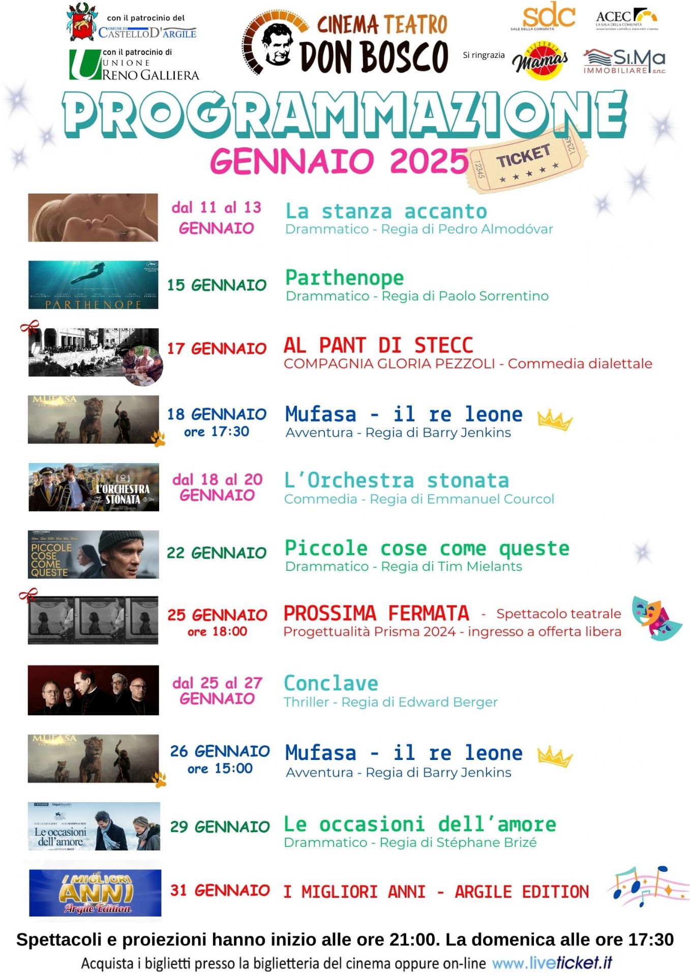 E' disponibile la programmazione delle rassegne cinematografiche in programma nel mese di GENNAIO 2025 presso il Cinema Teatro "Don Bosco" a Castello d'Argile in via Marconi 5