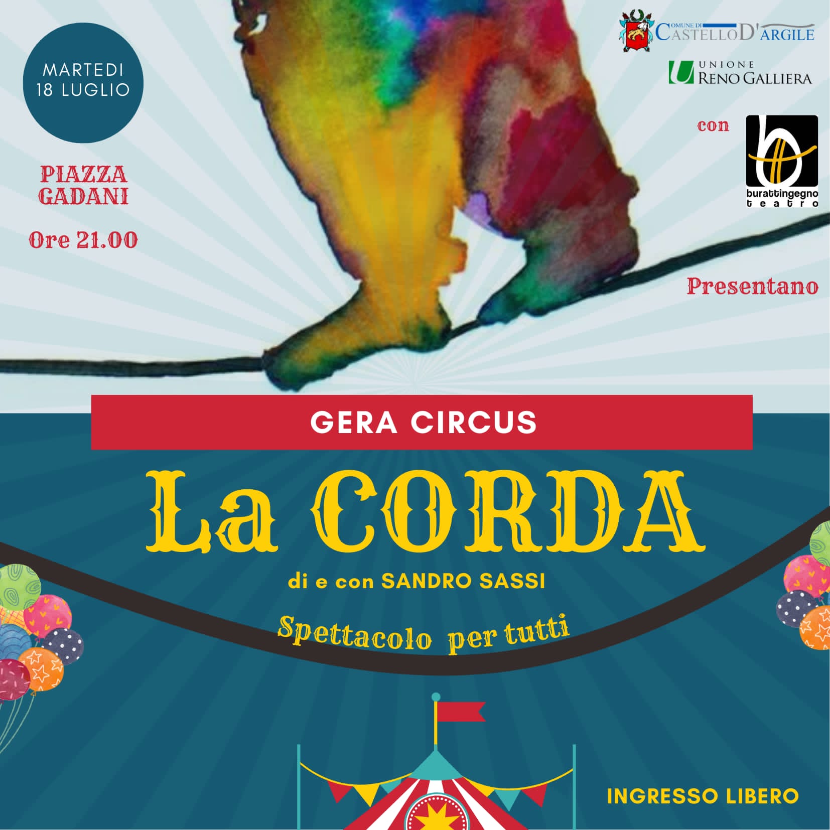 La Corda è uno spettacolo di circo, in strada, in cui Sandro Sassi, grazie alla sua sfrenata energia, fatta di fischi e grammelot da commedia dell’arte, coinvolgerà grandi e piccini, in una miscela di virtuosismi tra giocoleria con palline e cerchi, aprendo e chiudendo le danze con una corda: dopo aver scelto otto spettatori, scaldandoli con il gioco del tiro alla fune, camminerà su questa, tenuta in tensione dai volontari, facendo giocoleria con oggetti infuocati! All’apice della performance, la combinazione di equilibrio su una grossa sfera, giocoleria con le clave e una scopa sul mento.