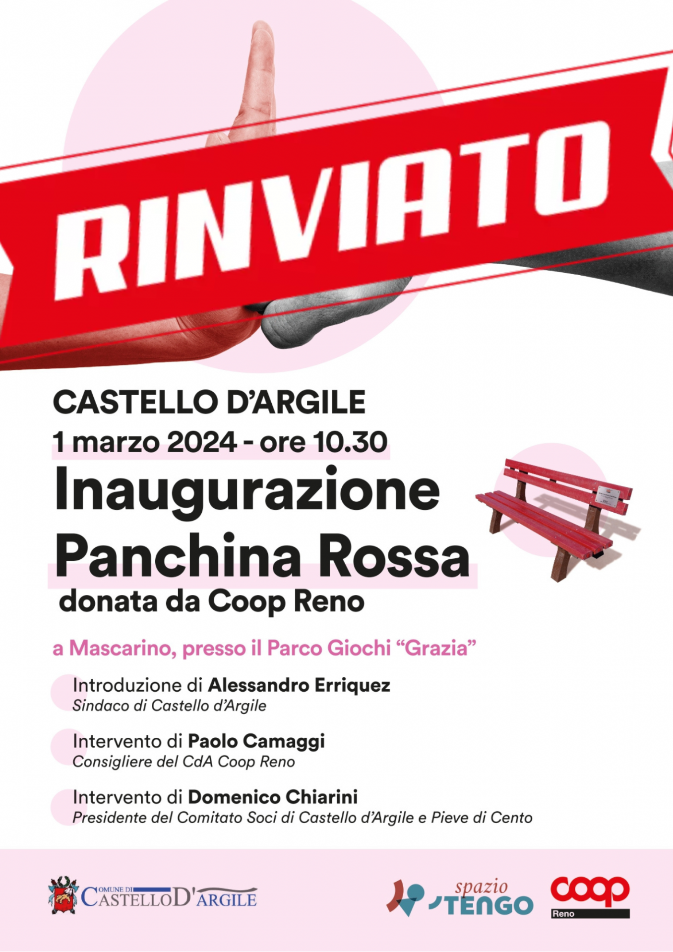 Con l'intento di ricordare che i maltrattamenti nei confronti delle donne avvengono sistematicamente anche nelle nostre comunità, nei luoghi che ci sono familiari, nei piccoli e grandi centri, Coop Reno ha donato al Comune di Castello d'Argile una panchina rossa, che verrà posizionata nella frazione di Mascarino presso il Parco Giochi "Grazia".