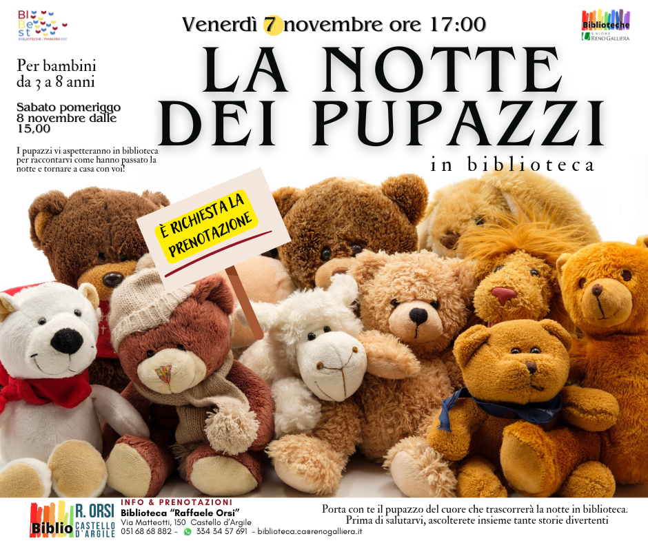 Sabato 8 novembre al pomeriggio dalle ore 15:00 i pupazzi vi aspetteranno in Biblioteca per raccontarvi come hanno passato la notte e tornare a casa con voi!