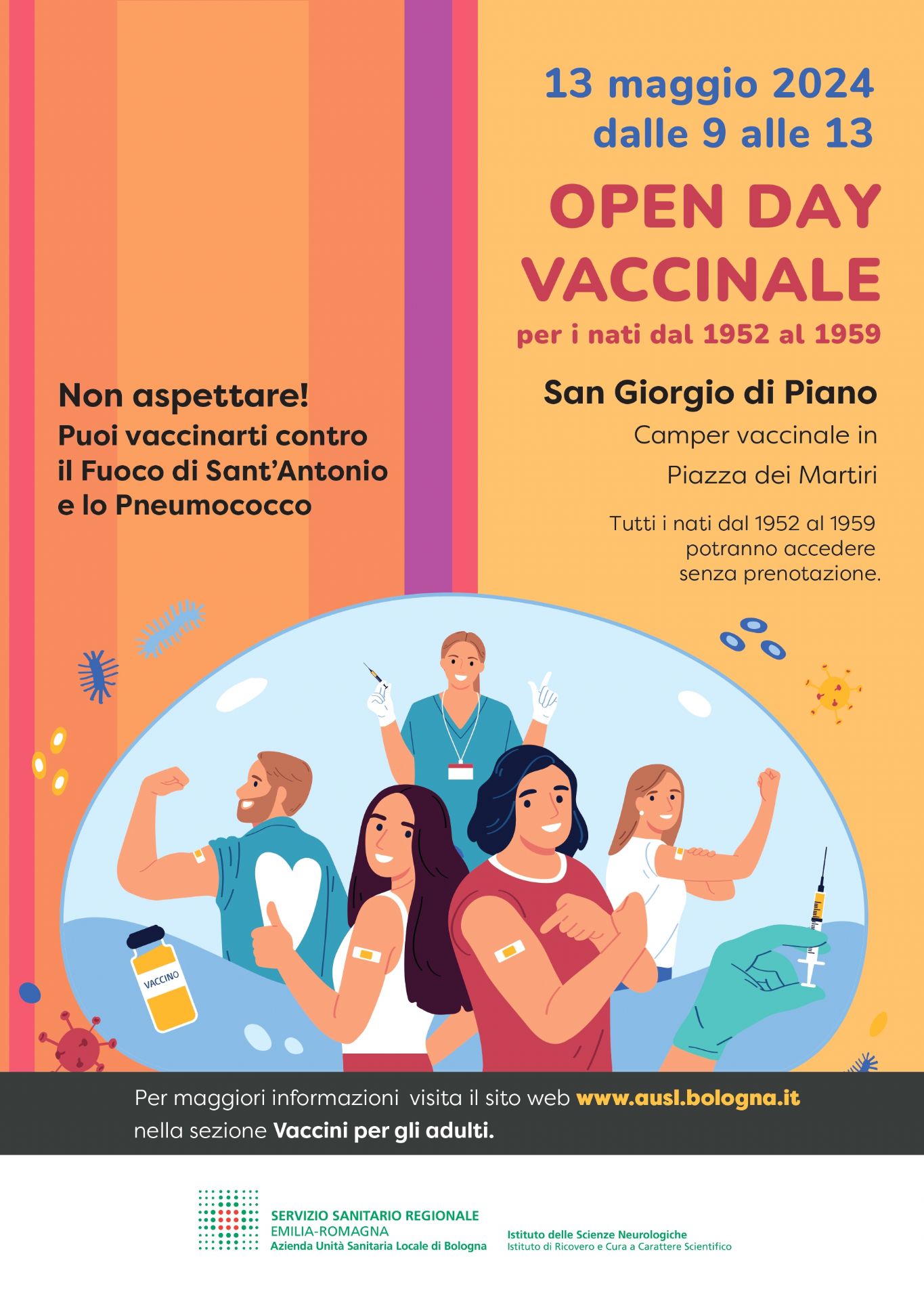 LUNEDI' 13 MAGGIO 2024 dalle h. 9.00 alle h. 13.00 a San Giorgio di Piano in Piazza dei Martiri tutti i nati dal 1952 al 1959 potranno accedere senza prenotazione al Camper vaccinale per vaccinarsi contro il Fuoco di Sant'Antonio e lo Pneumococco.