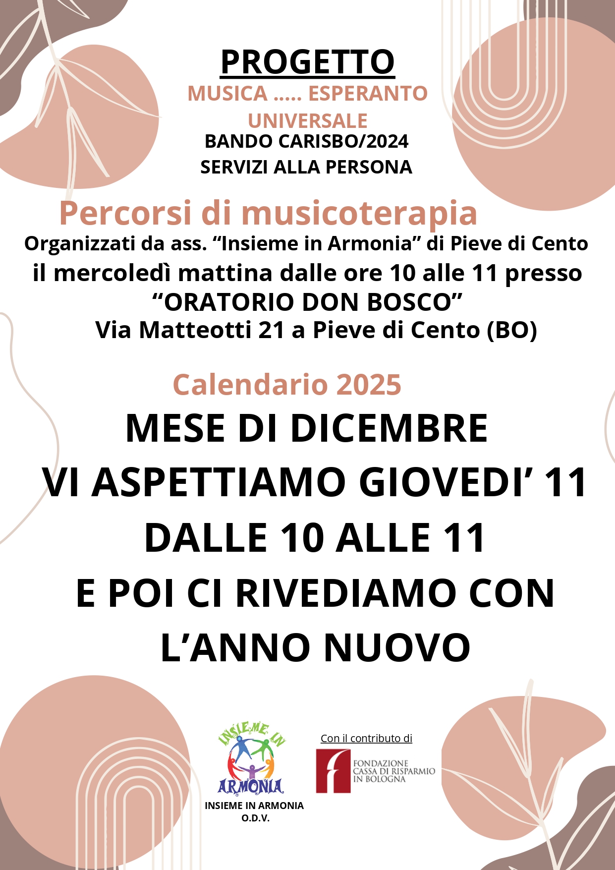 Giovedì 11 dicembre 2025 dalle ore 10 alle ore 11 presso l'Oratorio "Don Bosco" di Pieve di Cento, Via Matteotti 21 nell''ambito del Progetto Musica.... esperanto universale, ultimo incontro dell'anno organizzato dall'Associazione "Insieme in armonia"