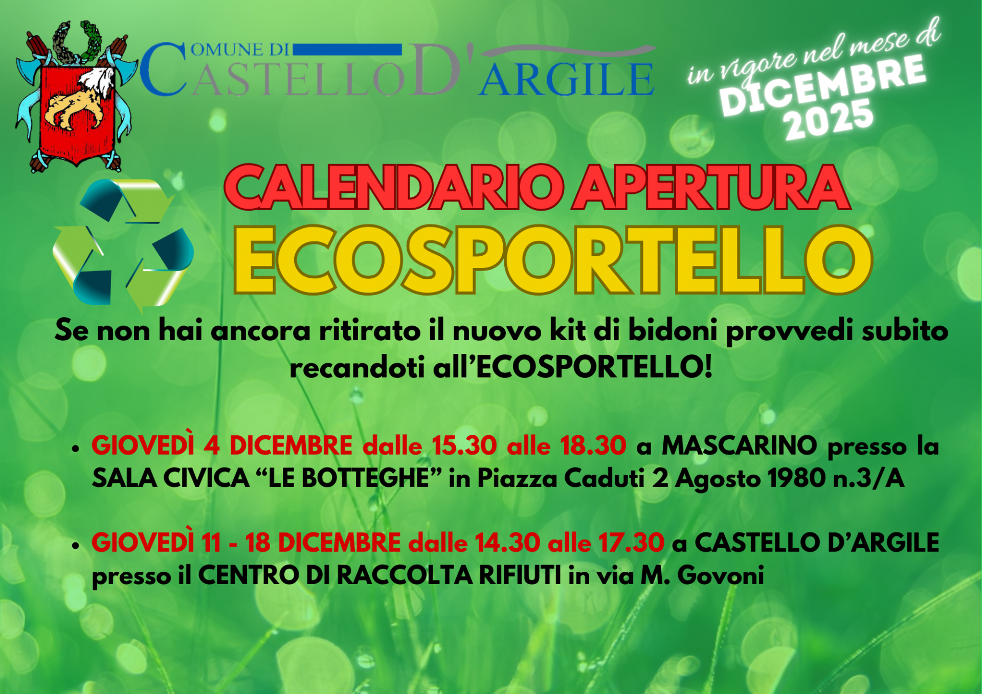 - Giovedì 11 -18 Dicembre dalle 14.30 alle 17.30 a CASTELLO D'ARGILE presso il Centro di Raccolta Rifiuti in via M. Govoni