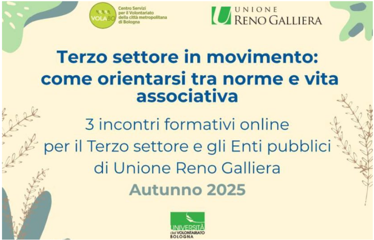 VOLABO – Centro Servizi per il Volontariato della Città metropolitana di Bologna in collaborazione con l’Unione Reno Galliera propone un ciclo di tre seminari online dedicati a tematiche centrali per la gestione degli Enti del Terzo Settore (ETS). L’iniziativa si inserisce nel progetto “Sostenere attivamente il volontariato, i volontari e le loro organizzazioni fonte di benessere sociale e salute. Se non ora quando?”, parte della convenzione stipulata tra A.S.Vo. ODV e Unione Reno Galliera (giugno 2025 – dicembre 2027).