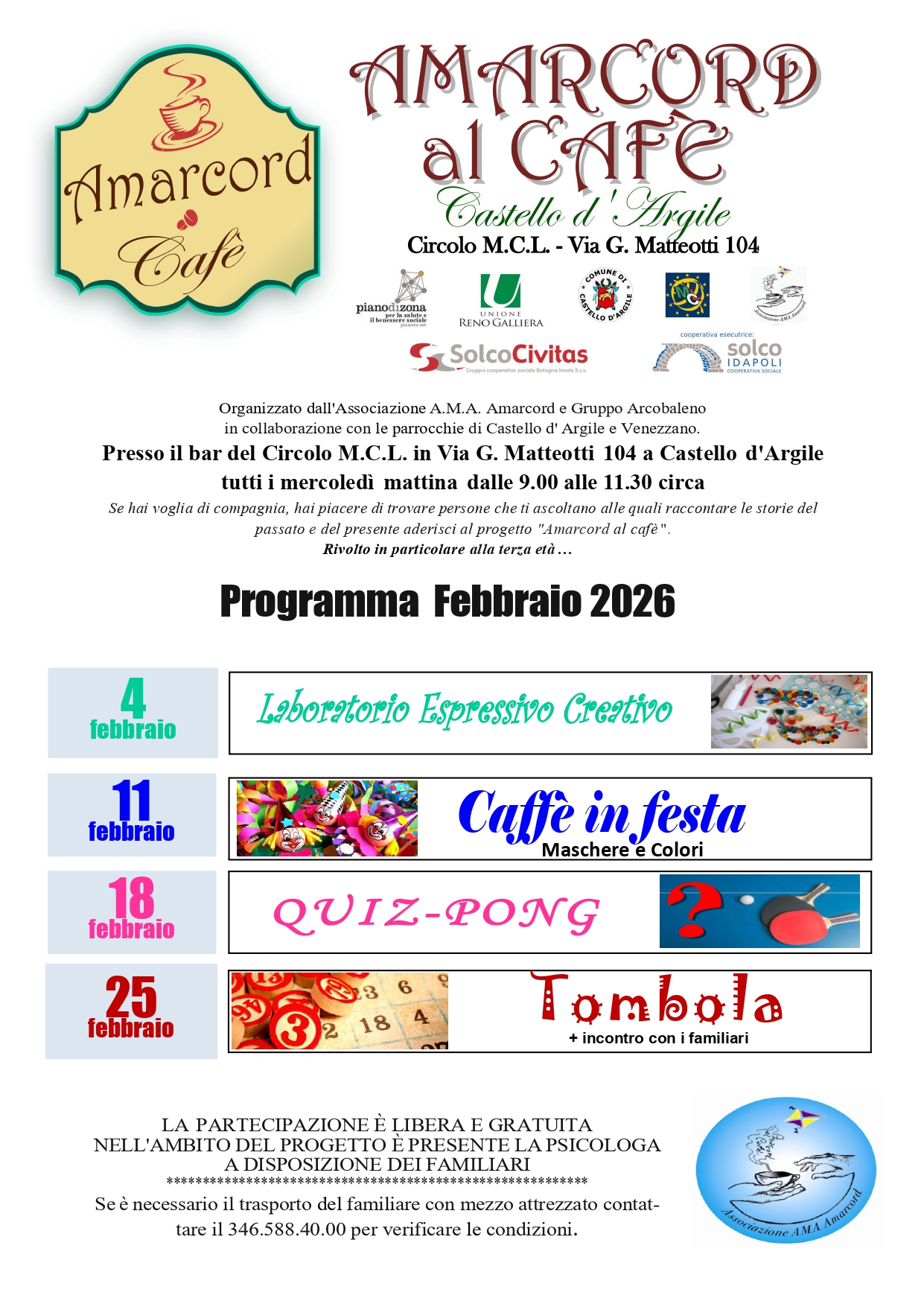 Organizzato dall'Associazione A.M.A. Amarcord e Gruppo Arcobaleno, in collaborazione con le Parrocchie di Castello d'Argile e Venezzano, presso il bar del Circolo M.C.L. in via G. Matteotti 104 a Castello d'Argile, tutti i mercoledì mattina dalle 9.00 alle 11.30 circa.