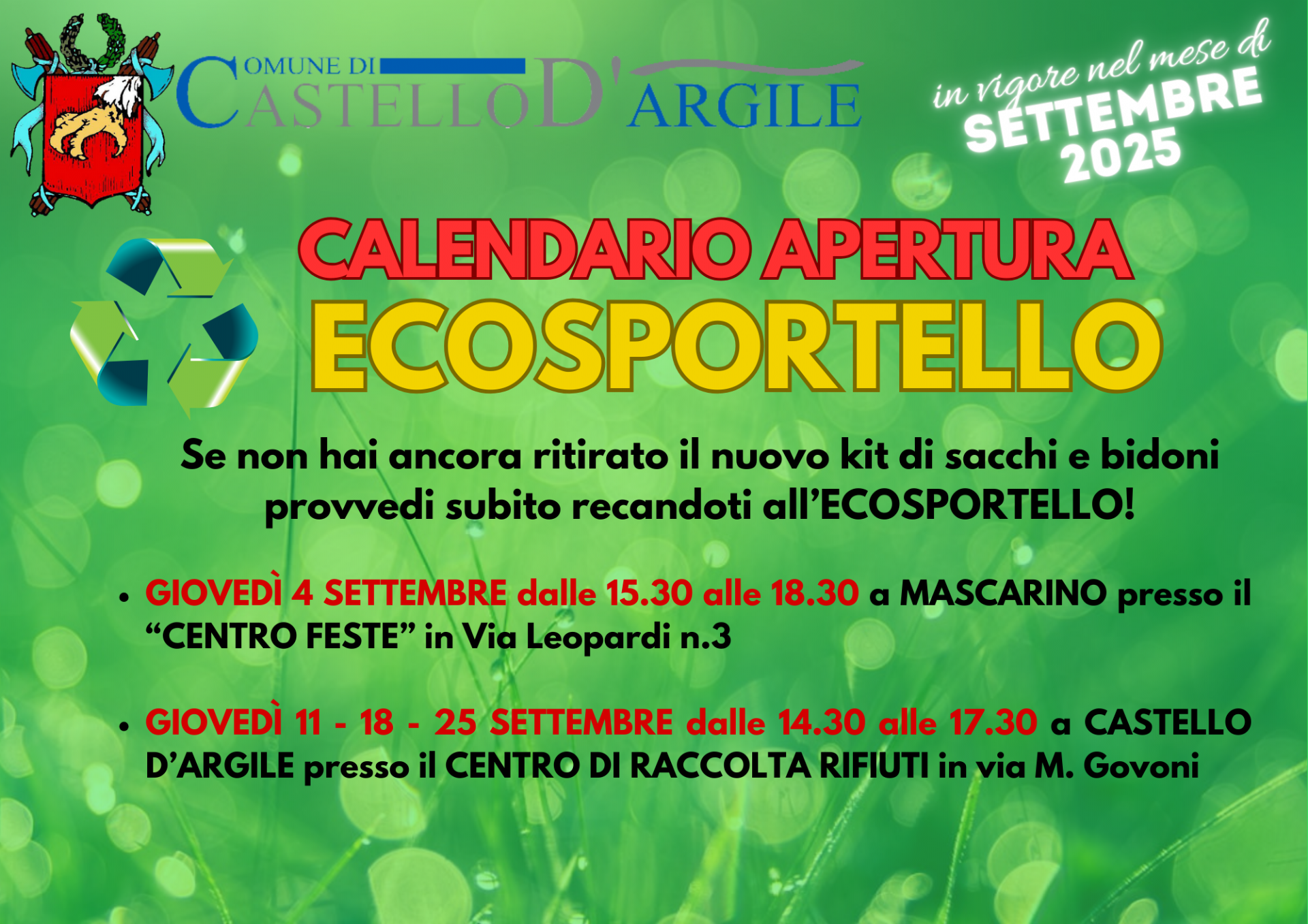 - Giovedì 13 - 20 - 27 Novembre dalle 14.30 alle 17.30 a CASTELLO D'ARGILE presso il Centro di Raccolta Rifiuti in via M. Govoni