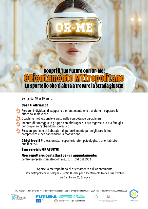 Lo Sportello metropolitano di orientamento e ri-orientamento è gestito dalla Città metropolitana di Bologna e si trova presso il Centro Risorse per l’Orientamento Maria Luisa Pombeni in via San Felice 25 a Bologna.
