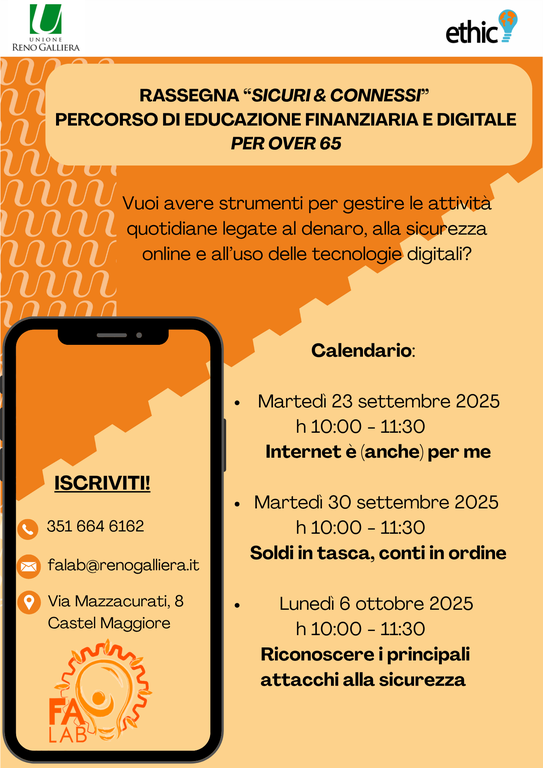Parte presso il FaLab dell'unione Reno Galliera un ciclo di incontri gratuiti dedicati alle persone over 65, con l’obiettivo di fornire strumenti pratici e conoscenze di base per affrontare in modo più autonomo e consapevole le attività quotidiane legate al denaro, alla sicurezza online e all’uso delle tecnologie digitali.