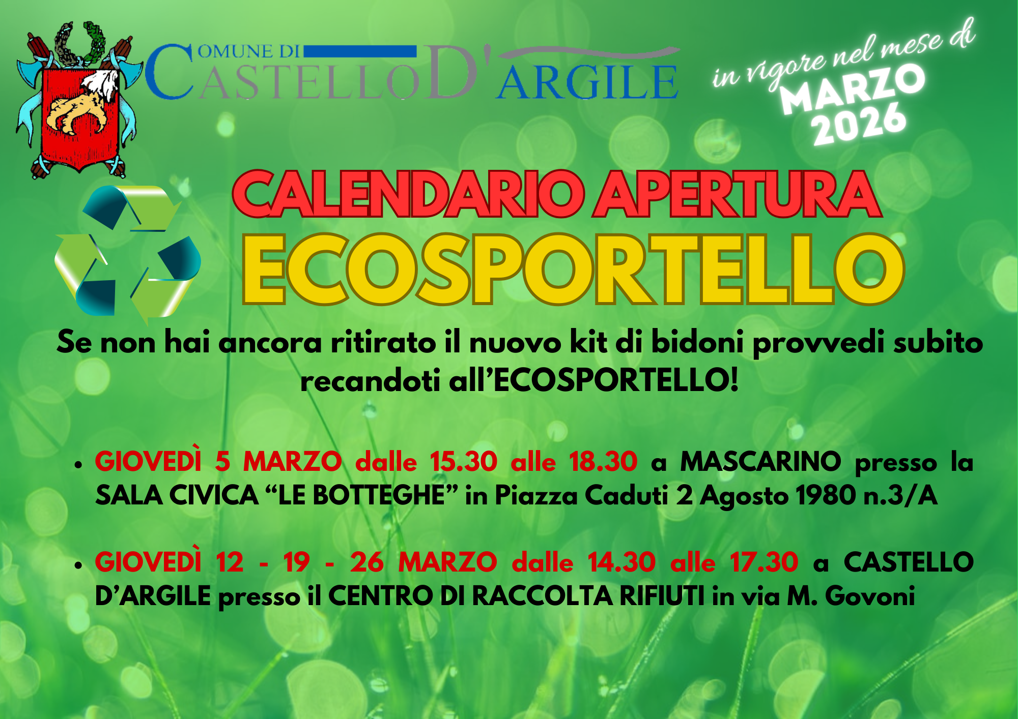 Giovedì 12 - 19 - 26 marzo dalle 14.30 alle 17.30 a CASTELLO D'ARGILE presso il Centro di Raccolta Rifiuti in via M. Govoni