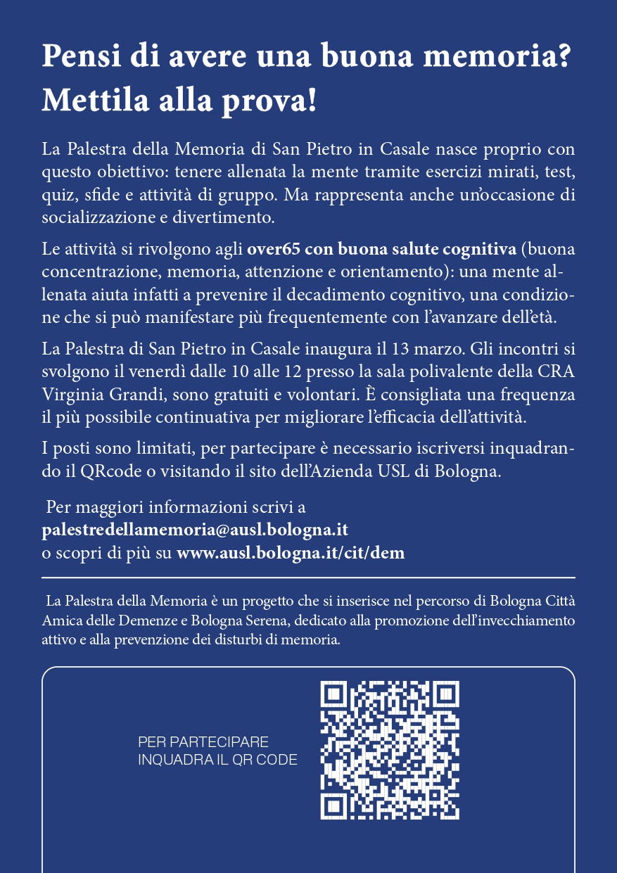 La Palestra della Memoria si inserisce nel percorso di Bologna Città Amica delle Demenze e Bologna Serena, progetti dedicati alla promozione dell’invecchiamento attivo e alla prevenzione dei disturbi di memoria.