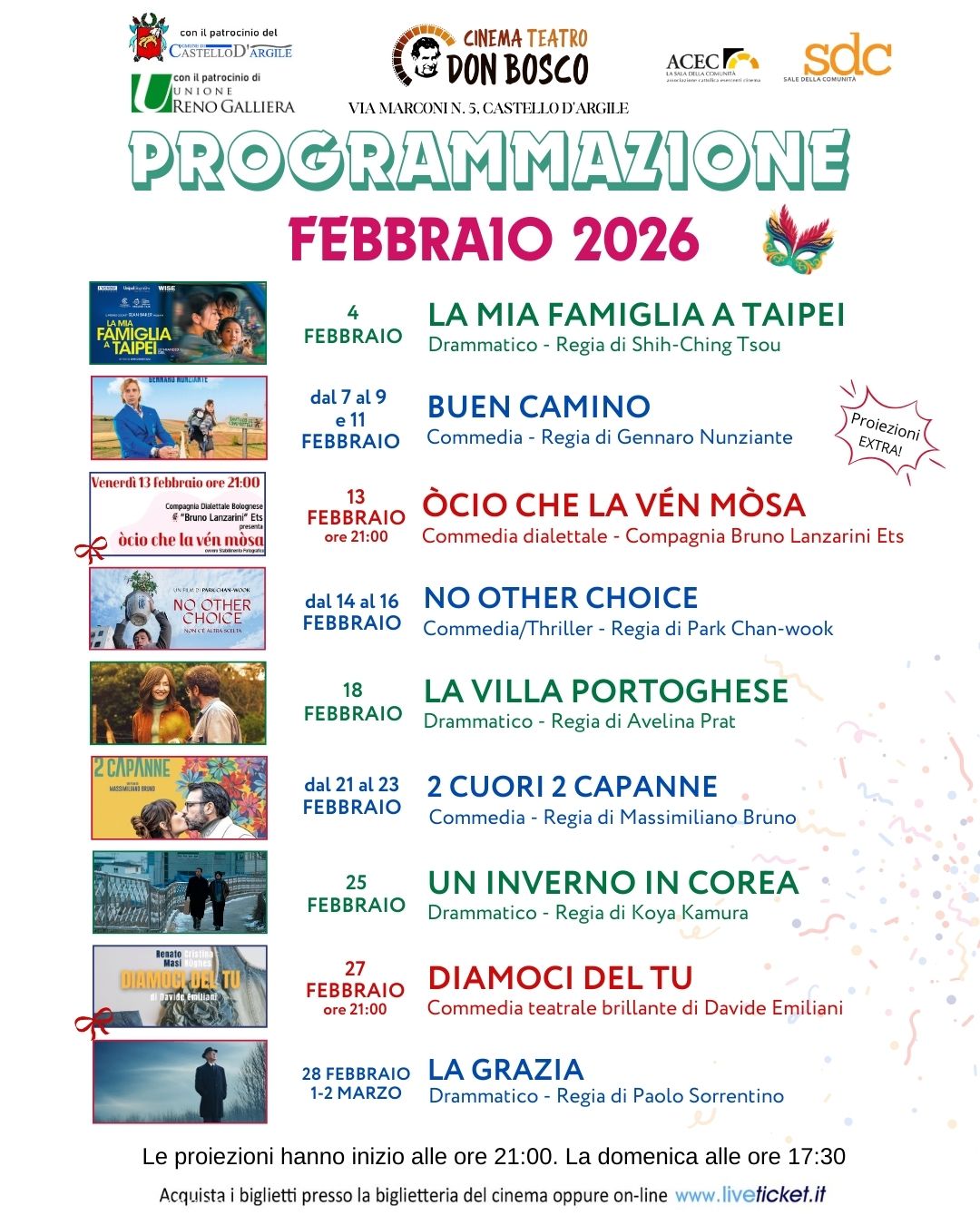 E' disponibile la programmazione delle rassegne cinematografiche in programma nel mese di FEBBRAIO 2026 presso il Cinema Teatro "Don Bosco" a Castello d'Argile in via Marconi 5.