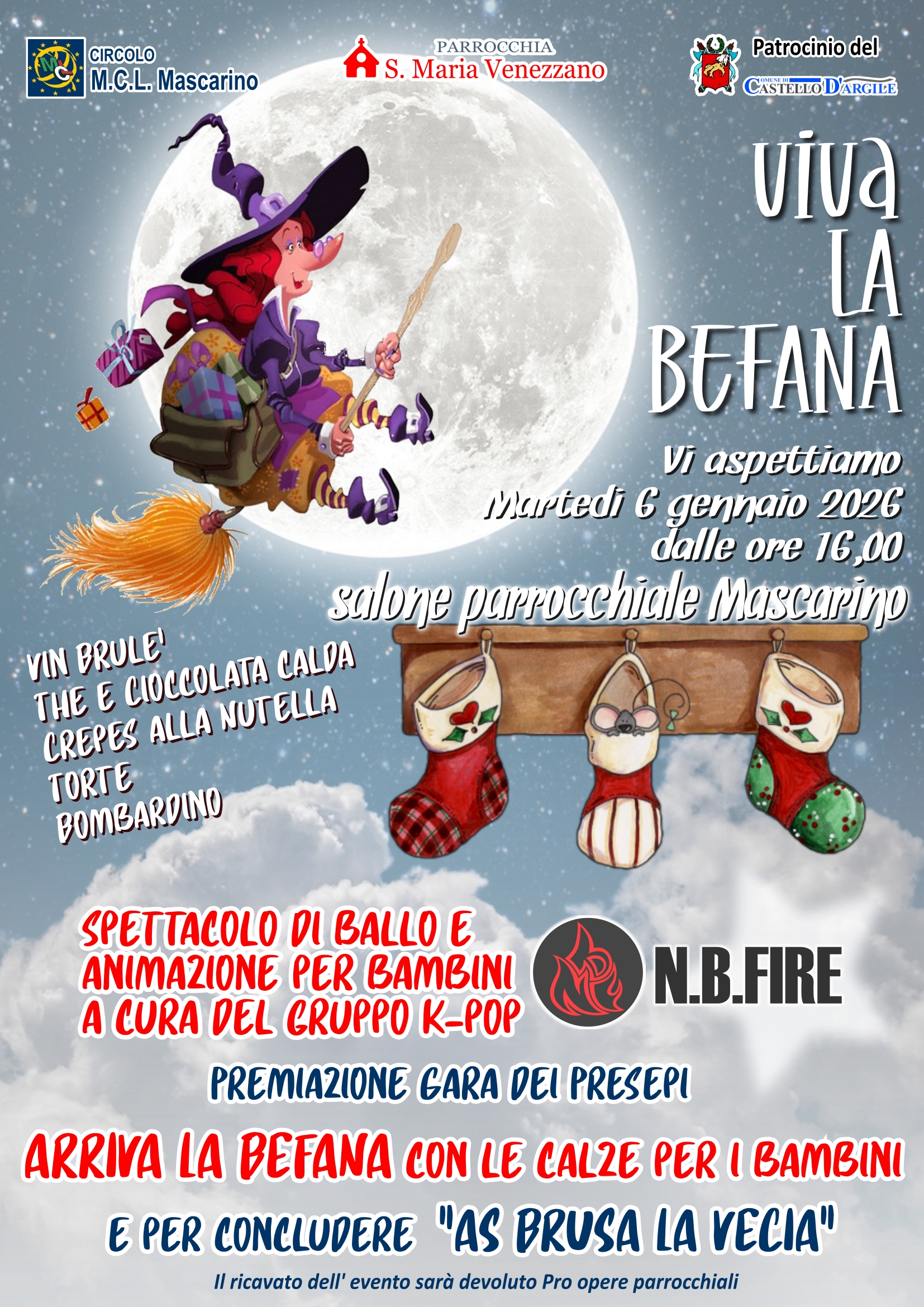 Martedì 6 gennaio 2026 dalle ore 16:00 presso il Salone Parrocchiale di Mascarino arriva la Befana con le calze per i bambini